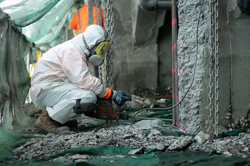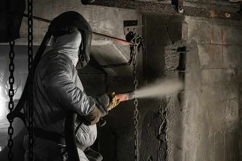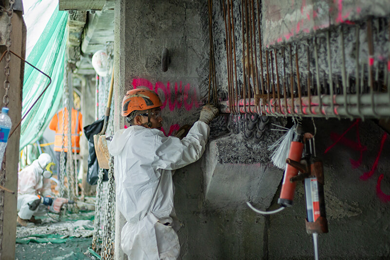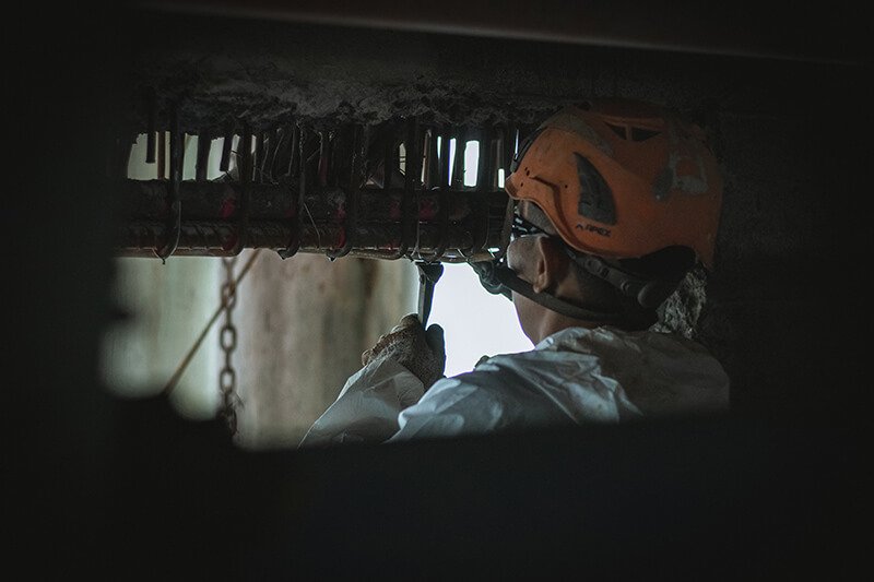 The scale of the project was significant: 800 repairs and 160m³ of concrete. Over 17 months, a crew of 10-18 people worked between May 2022 and October 2023. The solution involved hydro-demolition of the degraded reinforced concrete elements to remove chloride-contaminated concrete, followed by reconstruction with high-strength dry sprayed concrete—a proven method in marine remediation.